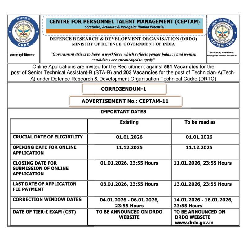 The Defence Research and Development Organisation (DRDO) has officially released the CEPTAM-11 Recruitment 2025 Notification for 764 vacancies. The recruitment is conducted through the Centre for Personnel Talent Management (CEPTAM) for posts including Senior Technical Assistant (STA-B) and Technician-A. Eligible candidates can apply online through the official DRDO website.