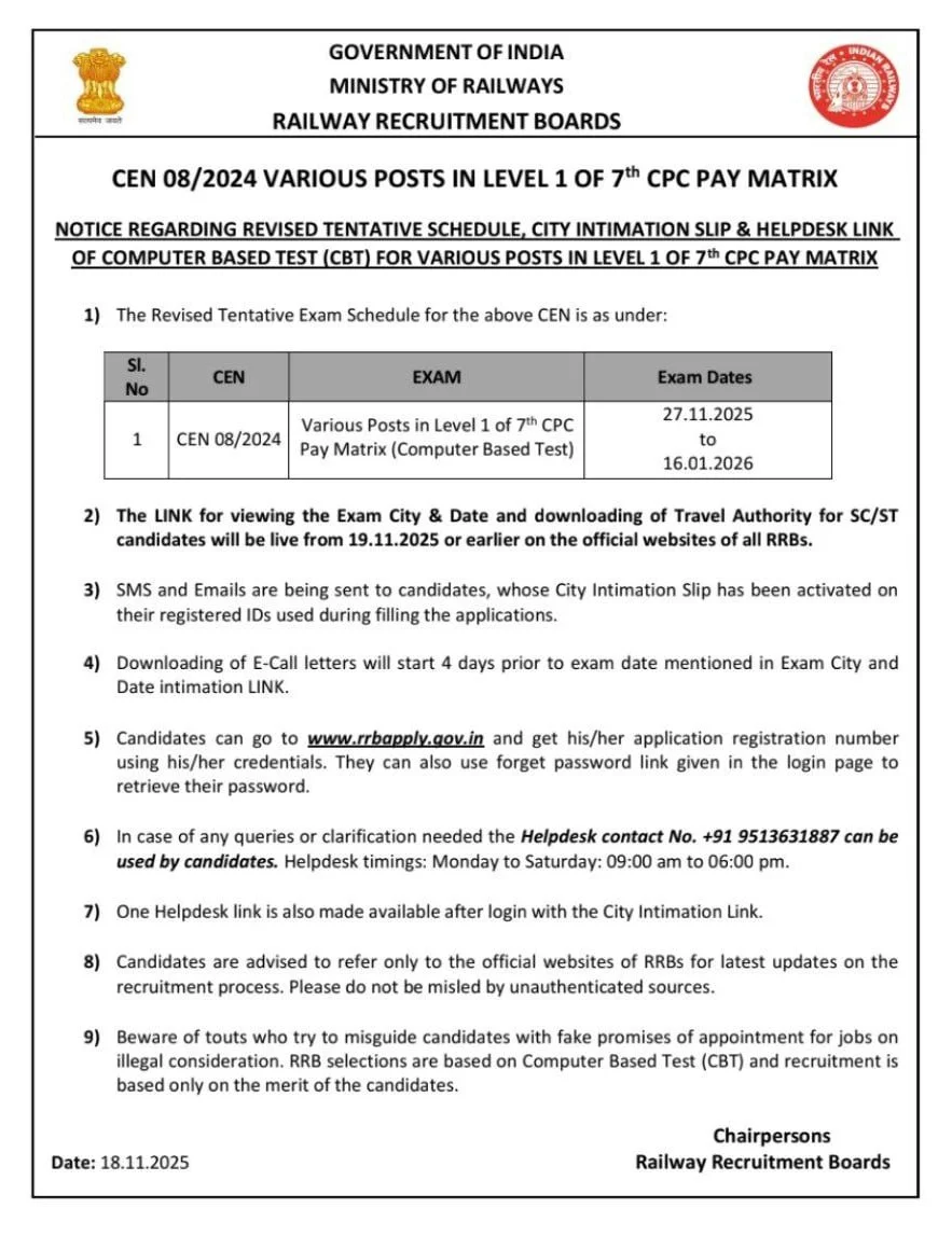 RRB Group D Exam Date27 November 2025- 16 January 2026